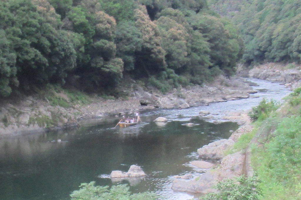 - 保津川下りの船が静かに通過、乗船してみたいなー!