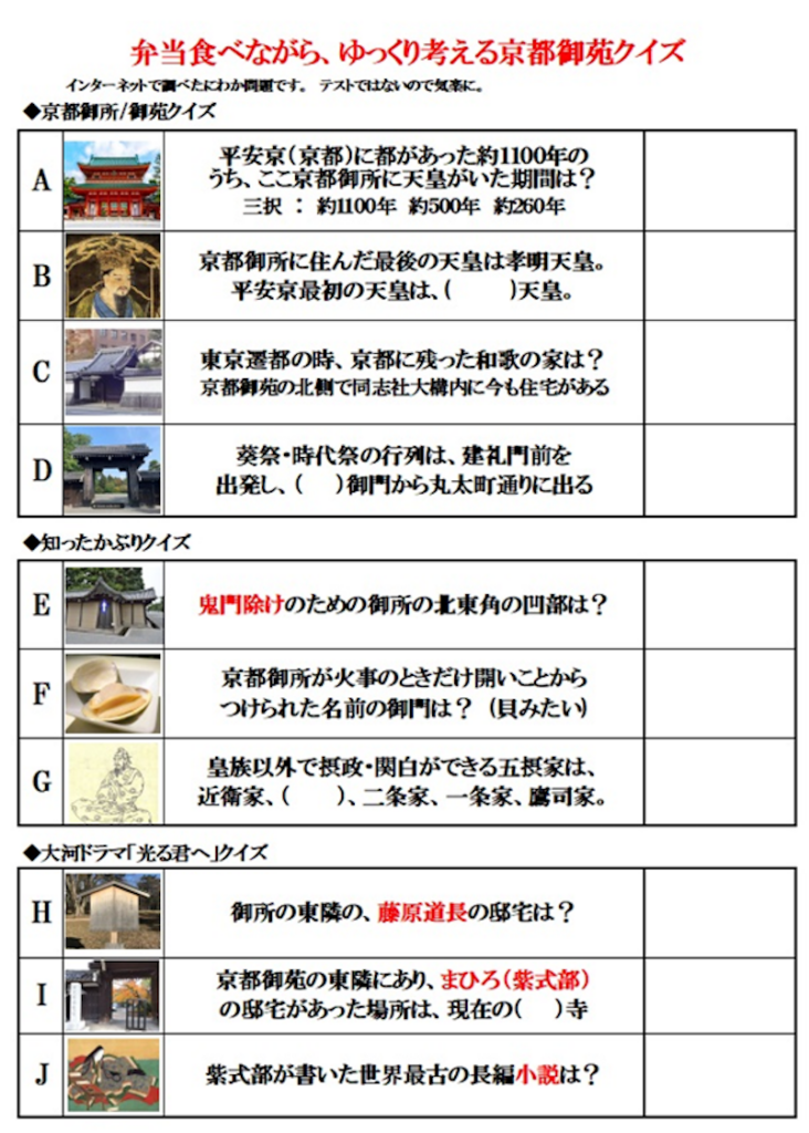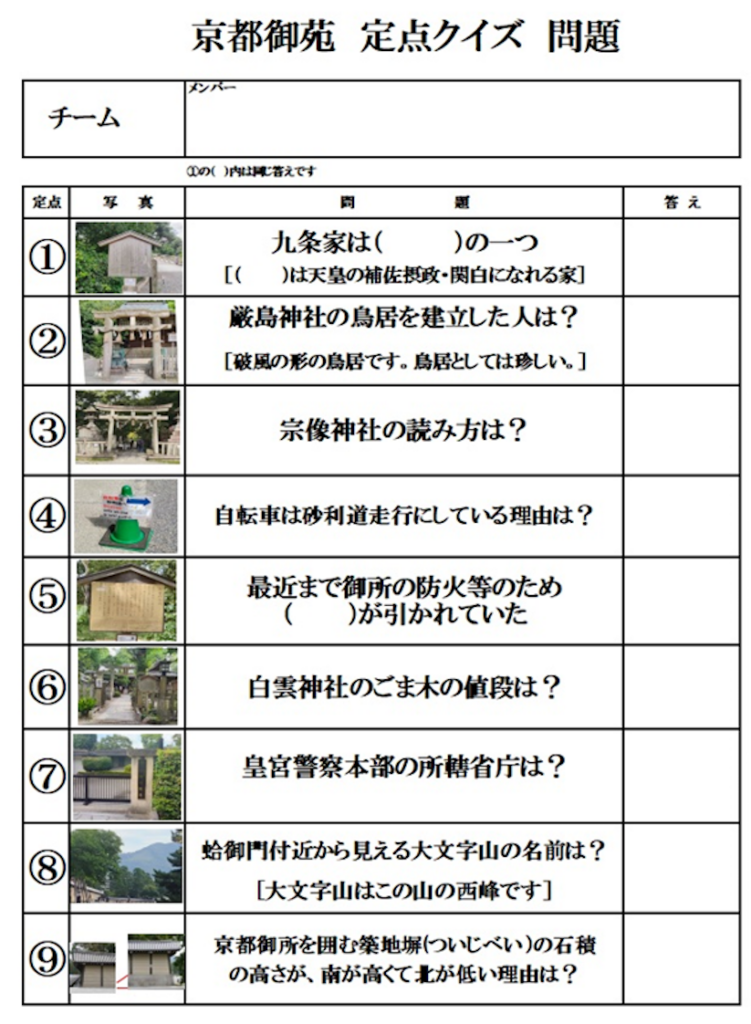 2024.11.22 健康づくり, 支部活動, 本部掲載, 行事検索連動 「秋の健康づくり活動:ミニウォークラリー」イベントを開催しました 興味のある方は京都御苑に行きクイズを解いてみてください。 チェックポイント(定点)クイズ、京都御苑に関する豆知識クイズを掲載します 回答は末尾のページをご覧ください 1 2 3 投稿者: takahashimutuo 健康づくり, 支部活動, 本部掲載, 行事検索連動 コメント: 1 ボウリング同好会 11月度例会を開催しました前の記事 2024度北部会員懇談会を開催しました次の記事