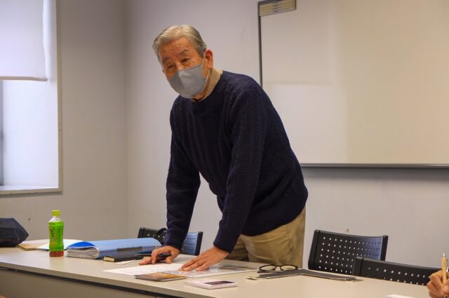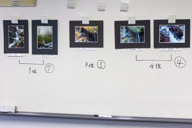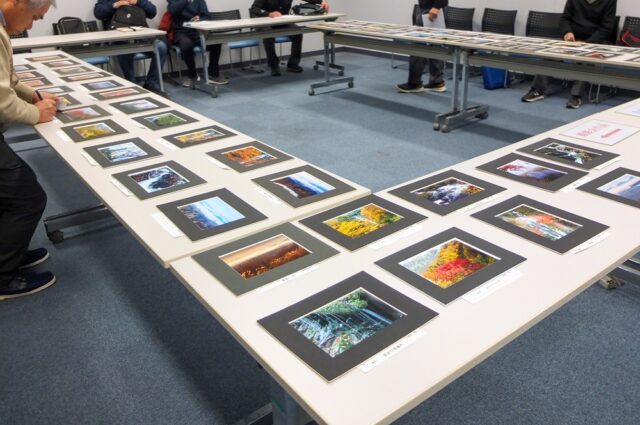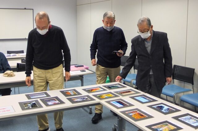 | ・今月の撮影会作品は「大山紅葉撮影旅行」参加者が一人4枚出品です。自由作品は一人2枚出品でした。各人3票ずつ投票して互選会を行いました。 ・投票集計後、入選作品を掲示し入選者が作品紹介を行い、八木さん、鎌田さんが寸評を行いました。 ・小休止の後、各人の作品紹介です。各人、作品の狙いや苦労した点を説明し、八木さん、鎌田さん、永田さんからコメントをいただきました。 |