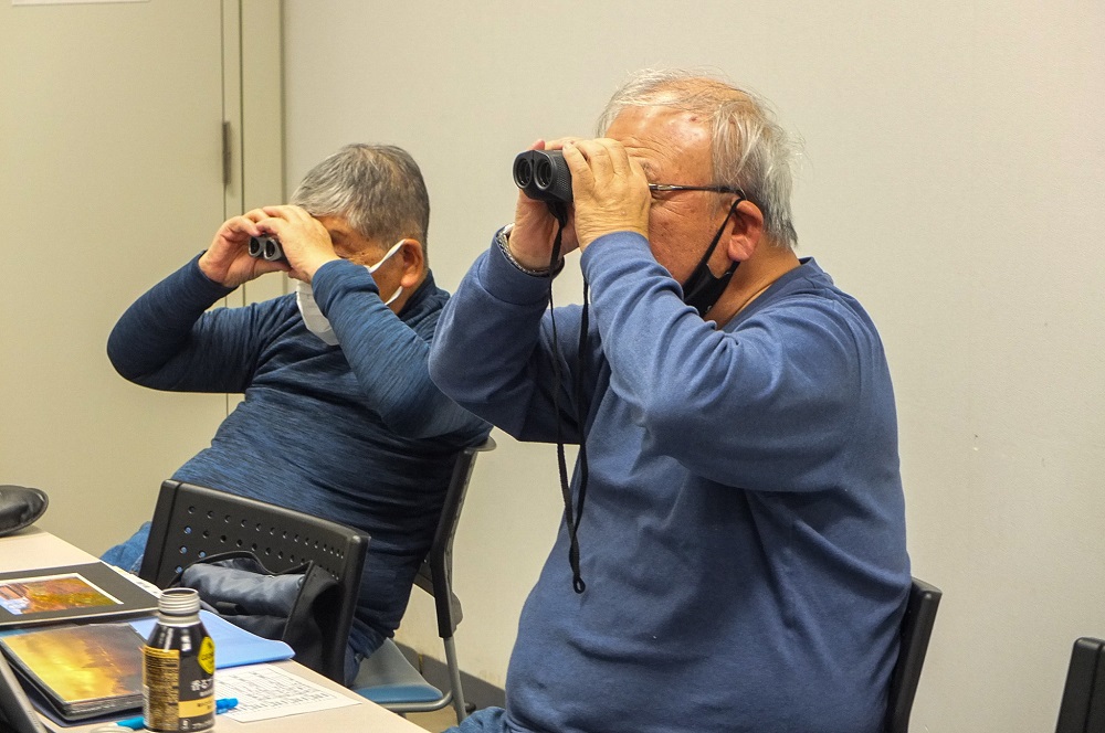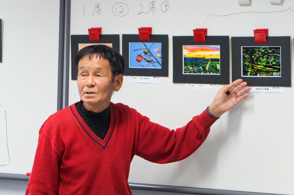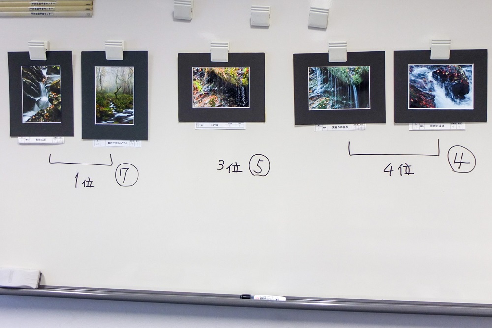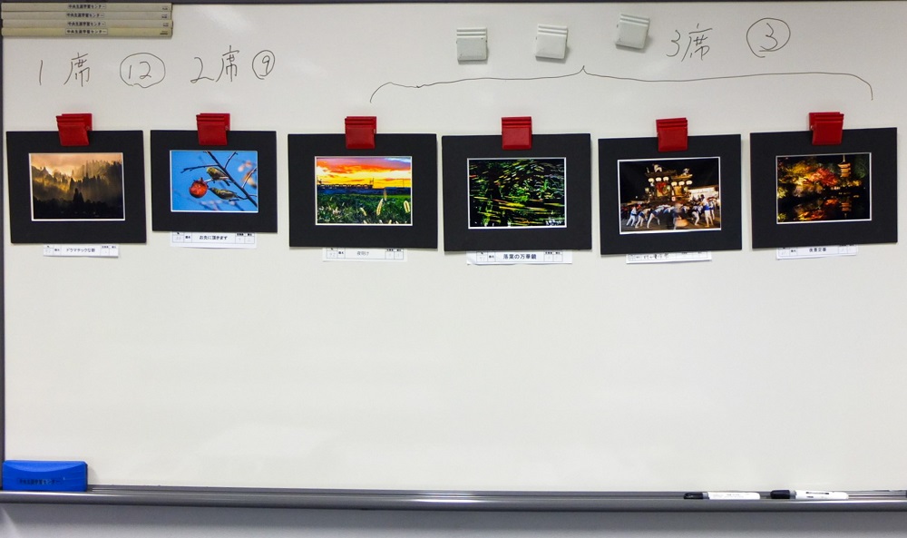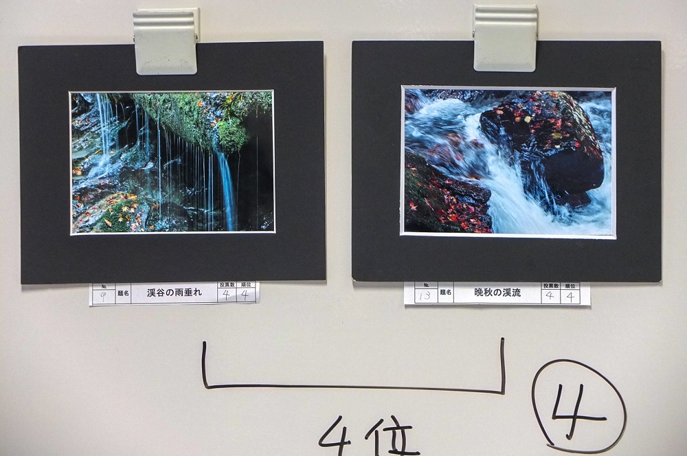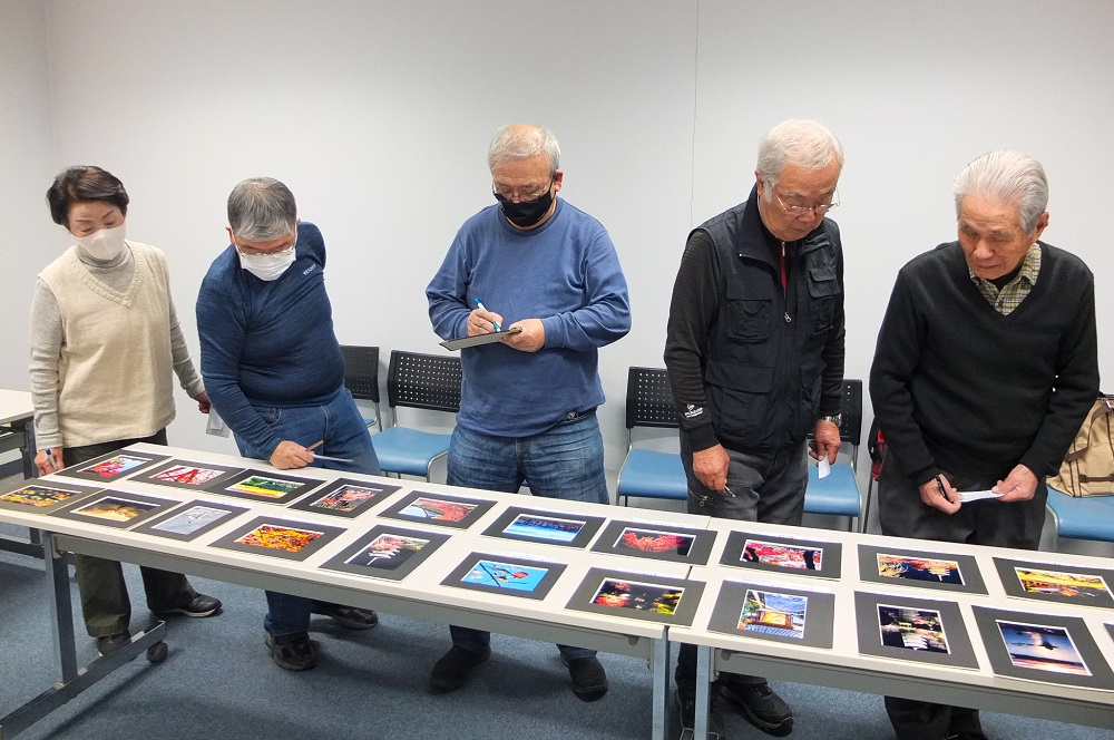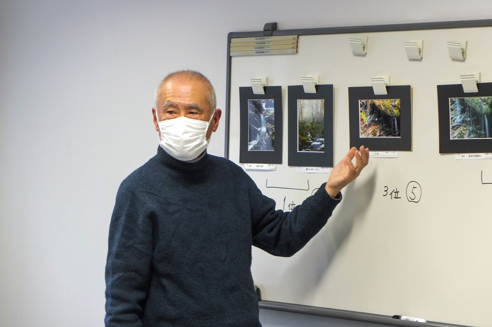 | ・今月の撮影会作品は「大山紅葉撮影旅行」参加者が一人4枚出品です。自由作品は一人2枚出品でした。各人3票ずつ投票して互選会を行いました。 ・投票集計後、入選作品を掲示し入選者が作品紹介を行い、八木さん、鎌田さんが寸評を行いました。 ・小休止の後、各人の作品紹介です。各人、作品の狙いや苦労した点を説明し、八木さん、鎌田さん、永田さんからコメントをいただきました。 |