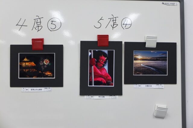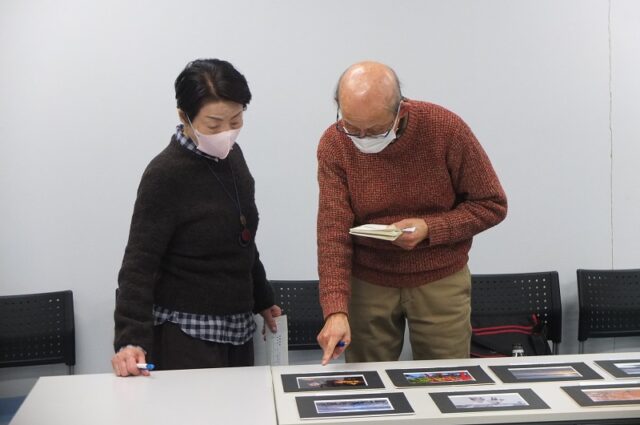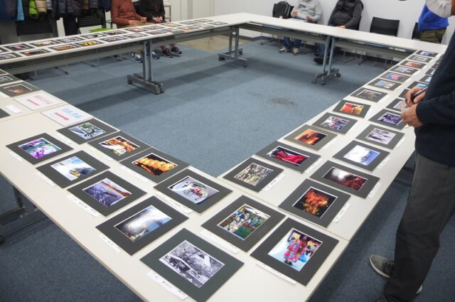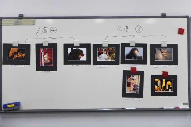 | ・互選会の撮影会作品は、1月23日の八坂神社周辺のテーマ撮影(光、金属、ポートレート)から2枚と自由作品2枚を並べ投票を行いました。 ・投票集計後、入選作品を白板に並べ入選者が作品紹介をし選出者が意見を述べた後、八木さん、鎌田さんが寸評を行いました。 今月は写真展出品作品の相談会を実施する為に個人の作品紹介は割愛されました。 |
