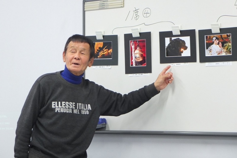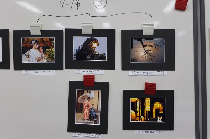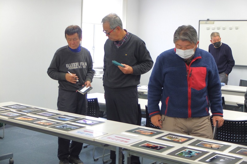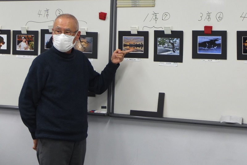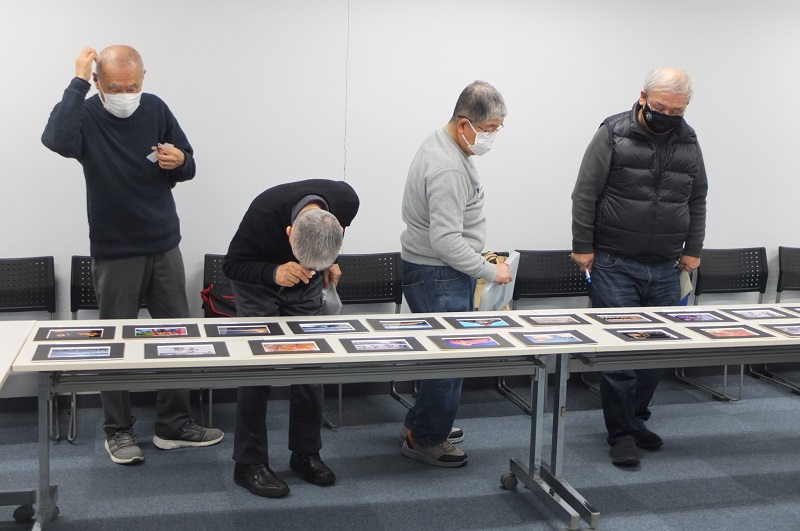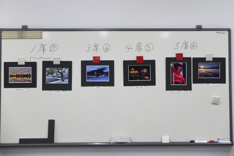 | ・互選会の撮影会作品は、1月23日の八坂神社周辺のテーマ撮影(光、金属、ポートレート)から2枚と自由作品2枚を並べ投票を行いました。 ・投票集計後、入選作品を白板に並べ入選者が作品紹介をし選出者が意見を述べた後、八木さん、鎌田さんが寸評を行いました。 今月は写真展出品作品の相談会を実施する為に個人の作品紹介は割愛されました。 |