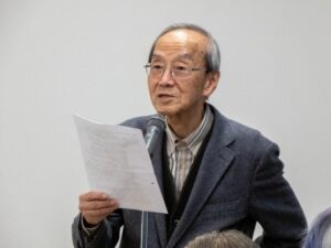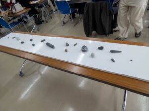 ご自身の趣味についても話をされました。水墨画と書でした。文房四宝(硯、墨、筆、紙)の中で,古墨と古硯が好きとのことで蒐集もされており紹介もされました。最後に彫刻家としての作品を現物を展示して見せていただきました。実際の石の中にご自身が作られた「石」を混ぜて、どれが木で作られた作品かを見分けるのは大変難しかったです。「天睨剣」の作品は映像で紹介されました。今回の講演から、人形の世界の奥深さや神秘性等を感じることが出来ました。まだまだ話足りないようでしたが、又のご縁が繋がることを期待しつつ講演会を終了しました。参加者は39名でした。