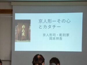 2024年度末に当たる2025年3月31日(月)に、「京都・学ぶ会」3月例会を開催しました。今回は『京人形ーその心とかたち』と題して、京人形司・彫刻家の岡本祥吾様にご講演をお願いしました。岡本様は、1982年14世京人形司面屋庄甫の長男として京都市にお生まれになり、今年43歳になられます。2002年大阪芸術大学彫刻科を中退されましたが、家業の京人形の制作と彫刻家としての創作の二刀流で活動されております。お父様が主宰されています「あまがつ会」には、第50回から現在まで継続して出品されており、他に「明日を担う京人形展」(高島屋美術画廊)、「京展」、個展と活躍の場を広げておられます。現在、京都工芸美術作家協会会員でもあります。