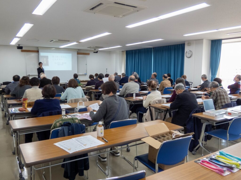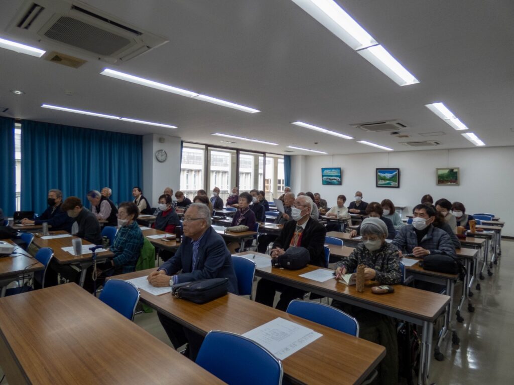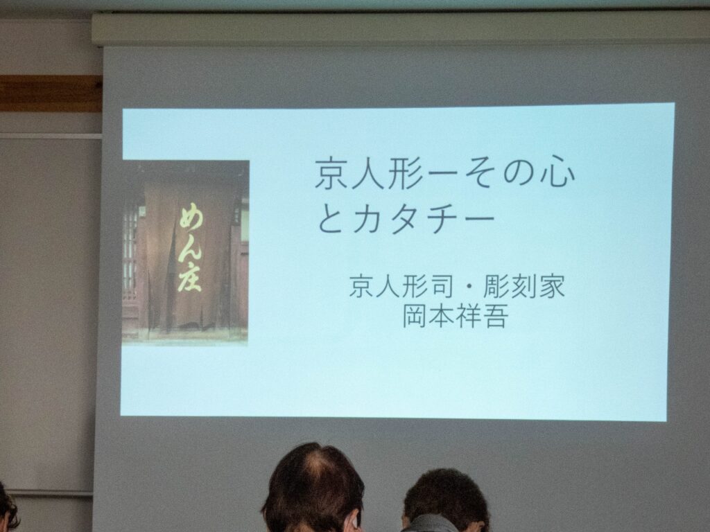 講演は、最初に1.「京人形面庄について」そのルーツと歴史について語られました。続いて、2.「さまざまな京人形」として、依り代、天児人形、雛人形、御所人形、市松人形、三つ折れ人形を映像で紹介されました。人形の歴史と種類の多さを知ると共に、信仰の対象としての人形「人形代(よりしろ)」や「流し雛」他興味深い人形が多々ありました。3.「京人形の作り方」では、工程が多数ある制作手順が紹介されました。塑像(粘土)、長年寝かせた桐材(胡粉と膠との相性がいい)、木彫、胡粉(下・中・上塗り)膠、和歌張り、絵付け(開眼)の過程で色々な材料(日本画と殆ど同じ材料)や道具が使われることも知りました。4.「人形と作品解説」では、色々な人形を映像で拝見しました。どれも大変魅力的でした。身近に置いて愛でるのもいいなと感じました。5.「作品鑑賞―自然と人の形を感じる」では、面屋庄三の「人形は今を生きるひとのためにある」「精神性とは人形師の魂が人形に宿る」が印象に残りました。