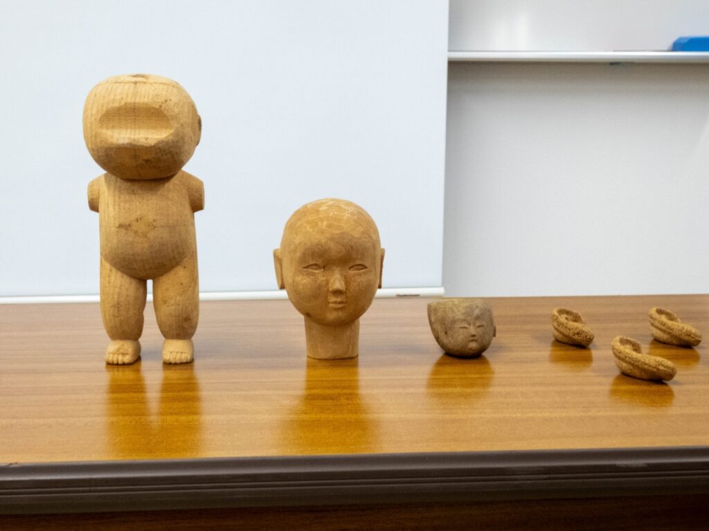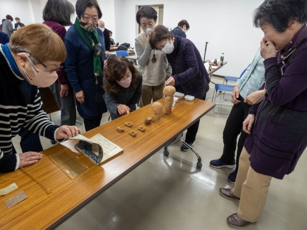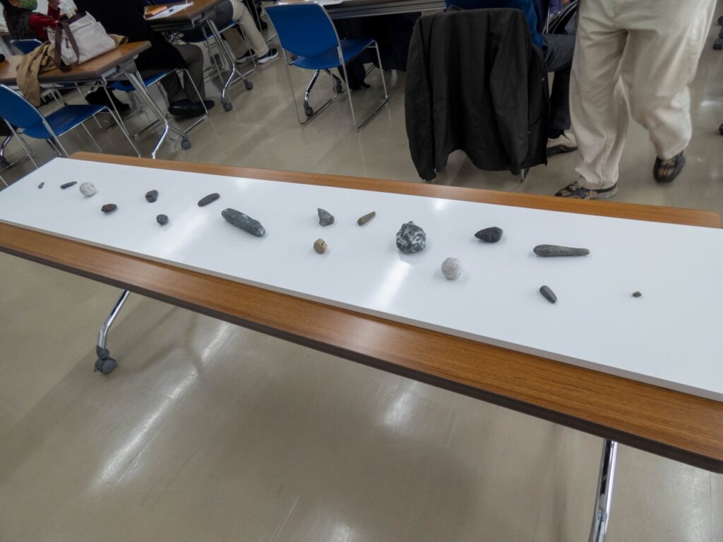 ご自身の趣味についても話をされました。水墨画と書でした。文房四宝(硯、墨、筆、紙)の中で,古墨と古硯が好きとのことで蒐集もされており紹介もされました。最後に彫刻家としての作品を現物を展示して見せていただきました。実際の石の中にご自身が作られた「石」を混ぜて、どれが木で作られた作品かを見分けるのは大変難しかったです。「天睨剣」の作品は映像で紹介されました。今回の講演から、人形の世界の奥深さや神秘性等を感じることが出来ました。まだまだ話足りないようでしたが、又のご縁が繋がることを期待しつつ講演会を終了しました。参加者は39名でした。