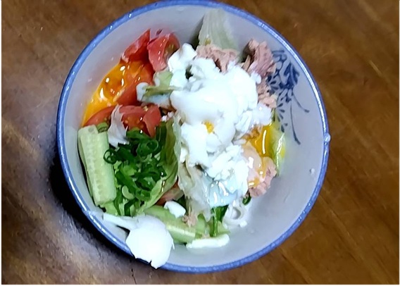 ➌器に➋、カットしたピーマン、トマトとツナ、温泉卵を盛り付け、[A]をかけてレモンを添える。