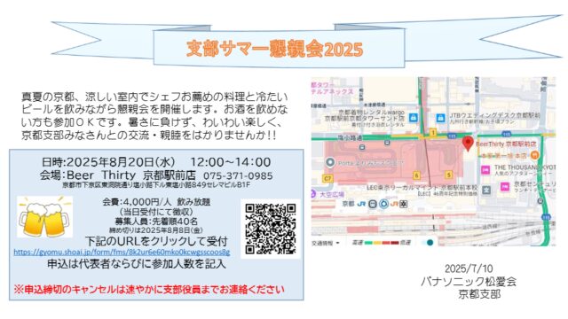 2025.07.13 お知らせ 支部サマー懇親会開催のご案内 サマー懇親会に出席される方は下記のURLをクリックし申し込んでください。 https://gyomu.shoai.jp/form/fms/8k2ur6e60mko0kcwgsscoos8g 投稿者: takahashimutuo お知らせ コメント: 0 2025年 6月末 会員動静(お名前)前の記事 仮想ウォーク 「平安京大内裏の案内板めぐり」次の記事