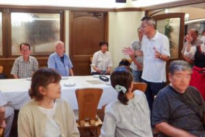 冷房の効いた室内で支部長の乾杯の挨拶のあと懇親会が始まり、久しぶり会う面々との会話が弾み、あちこちで笑いの渦が広がり、