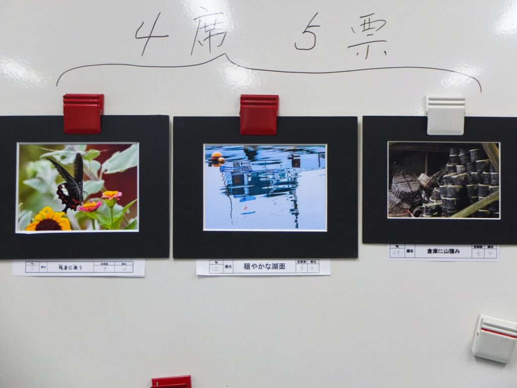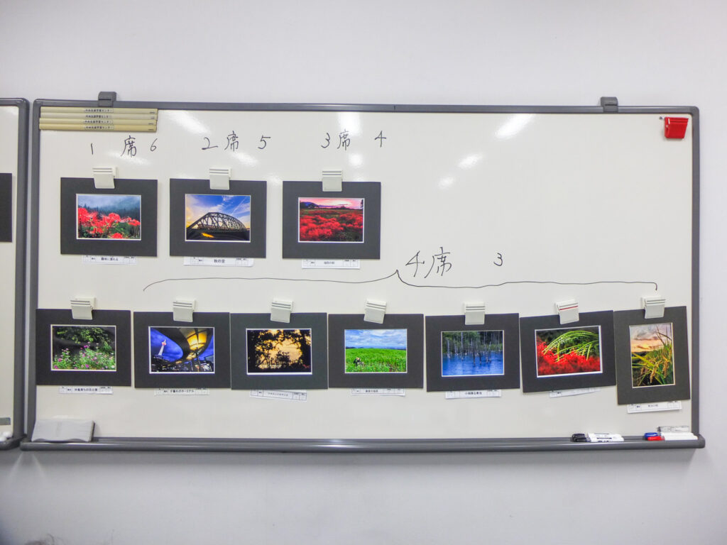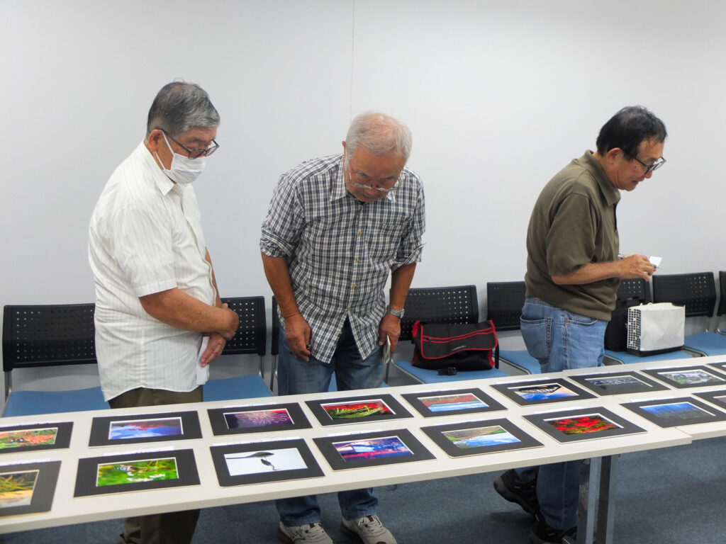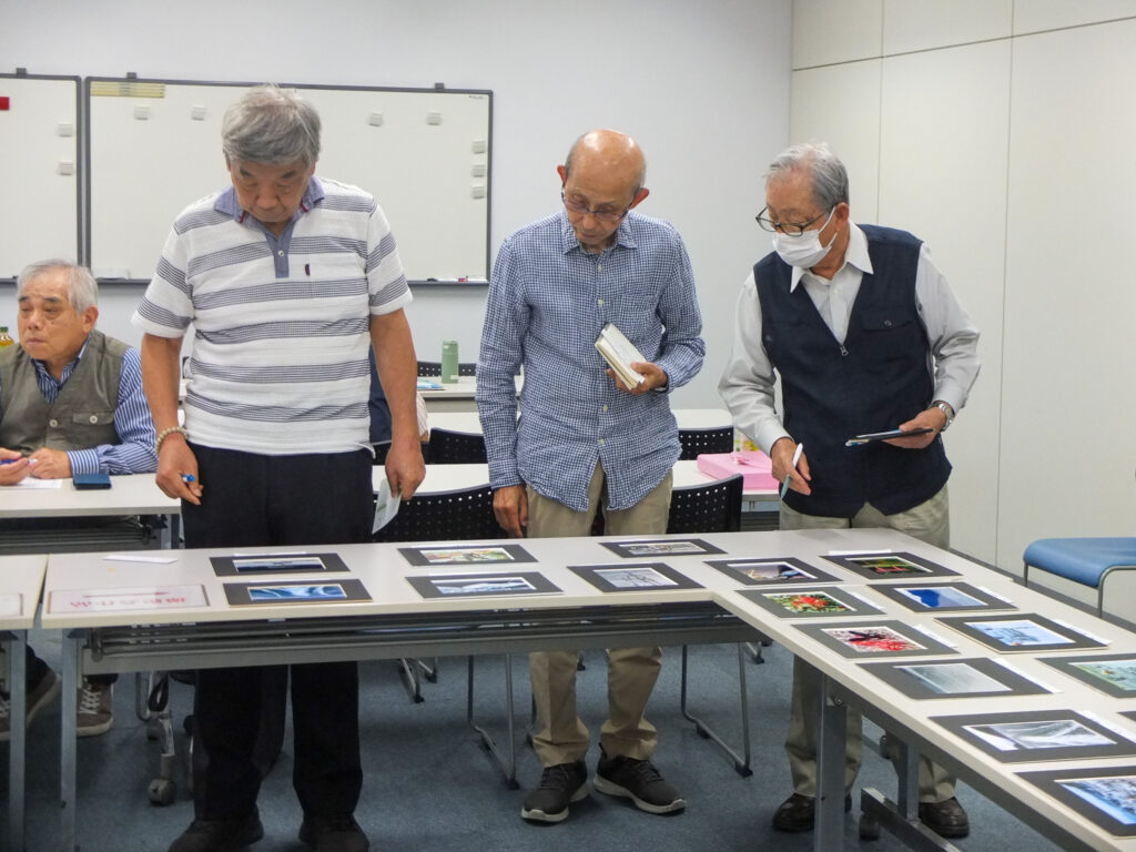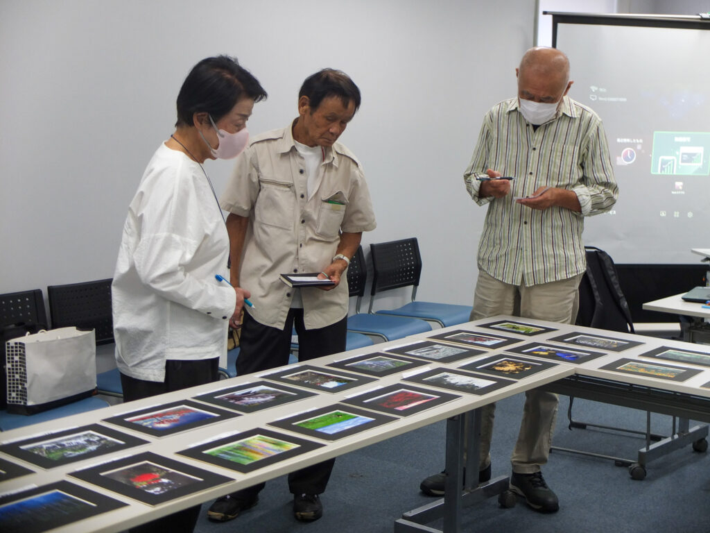 | ・今月の撮影会作品は、9月25日「琵琶湖 沖島」でした。沖島へは渡船に乗って渡り、島の風景を中心に撮影を行いました。互選会は撮影会作品、自由作品2枚ずつを並べ投票し実施しました。 ・投票集計後、入選作品を白板に掲示し、同時にプロジェクターで作品をスクリーンに投射し入選者が作品紹介を行った後、選定者が意見を述べ鎌田さん、八木さんが都度寸評し、その場で画像調整や切り取りの指導を受けて画像を修正しました。休憩後、GoogleDRIVEの各人作品のうち、評価意見を受けたい作品をプロジェクターで紹介し鎌田さん、八木さん、浦上さんから寸評と画像調整、切り取り等の指導を受けました。 ・大画面投射で見る作品は2L作品と違い、作者の狙い、構図、トリミング、映像調整を変えながら学習できる為、メンバー個々のレベルアップと同時に各人意見を出し合い有意義な会運営が図れました。 |