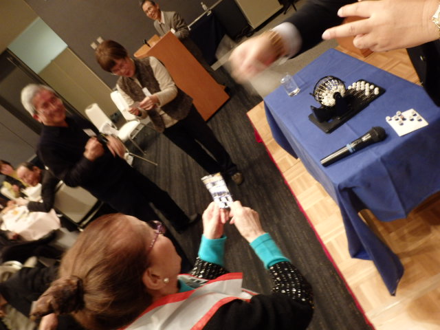 トップ賞ホテル提供ペア食事券は、吉松さんがビンゴ 『私が主役です』のたすきで盛り上げ
