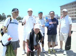 今回が第3回目で、過去2回我がチームが優勝しています。さて今回は7名の参加者で臨みました。場所は、今回も香蘭女子大コートです。良い天気ですが風が強いです。チームは、松九会、こがっち、松愛会の3チームで12試合を行いました。松九会と松愛会は、シルバー世代ばかりですが、こがっちは若者と女性もおり生き生きと見えます。10時からゲーム開始、約3時間みんな出来る範囲で頑張りました。まれにみる大接戦で、最終ゲームで優勝が決まりました。優勝は若者を擁したこがっちチームで、年寄り2チームを破りました。こがっち⇒7勝5敗、松九会⇒6勝6敗、松愛会⇒5勝7敗)我がチームは残念ながら3位でした。