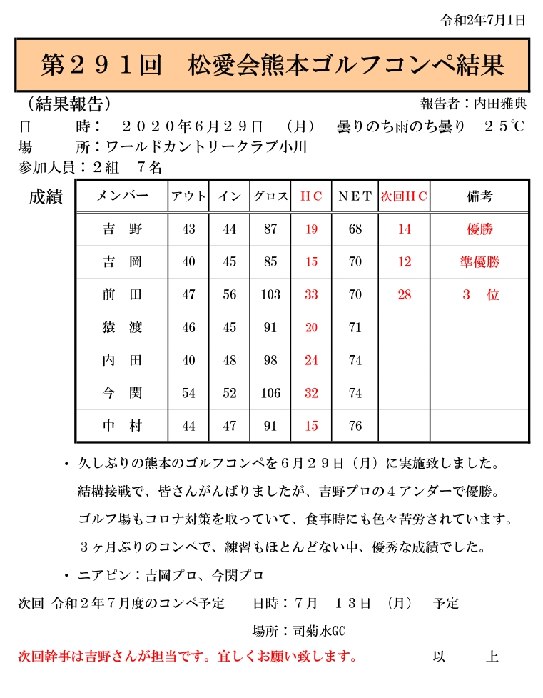 2020.07.1 ゴルフ会熊本, 同好会 熊本松愛会ゴルフコンペ令和2年6月度報告 熊本松愛会ゴルフコンペ令和2年6月度(291回) レストランの感染対策 優勝は吉野さん 2位吉岡さん 3位前田さん 投稿者: kouso ゴルフ会熊本, 同好会 コメント: 0