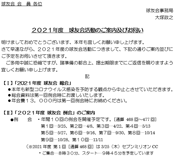 2021年度の球友会活動につきまして、下記の通りご案内並びにご予定をさせて頂きます。