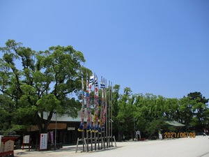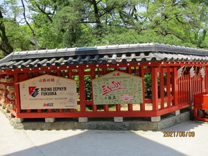 箱崎宮について・・・宇佐神宮(大分県)、岩清水八幡宮(京都府)と並んで日本三大八幡宮。ご祭神は現在の福岡県宇美町にお生まれになられた第十五代天皇である応神(おうじん)天皇を主祭神として神功(じんぐう)皇后、玉依姫命(たまよりひめのみこと)がお祀りされています。社殿には後に醍醐(だいご)天皇自らお書きになられた「徳の力をもって導き相手が自ら降伏するという」意味の「敵国降伏」の御宸筆(ごしんぴつ)が下賜されて(納められて)います。又、楼門(ろうもん)の上にも「敵国降伏」の扁額(へんがく)が掲げられています。又春のどんたく、夏の山笠、秋の放生会と並ぶ博多三大祭りが開かれ、今年は9月12日~9月18日の予定です。名物のガラス玩具のチャンポン、おはじきがあります。ちなみに放生会(ほうじょうや)とは「万物の生命をいつくしみ、殺生を戒め、秋の実りに感謝する」という神事のお祭りです。以上