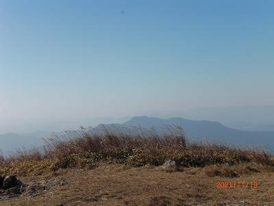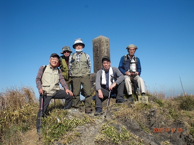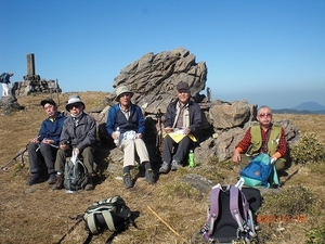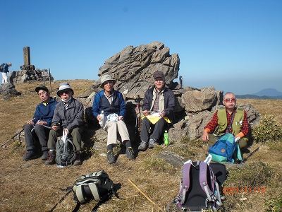 休憩の後、登りの道を進み天山山頂へ到着。広い草原状の山頂からは360度の素晴らしい眺めです。福岡方面の背振山・雷山、長崎方面の経ヶ岳・雲仙岳・有明海などが見えます。展望を楽しみながら、ゆっくりと昼食を摂り下山しました。今年の山楽会は今回で終了。結局コロナの影響などで3回のみ実施でした。