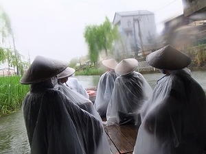 内容)10:05分に柳川駅を出て約10分程度で川下りの船会社に到着、支払いを済ませ船に乗り雨が降っていたので船会社用意の雨具を付けてで川下りをスタート、雨が激しくなり降りしきる雨の川下りでしたが女性の船頭さんの柳川弁の軽妙な案内で楽しく過ごせました。船を下りて船頭さんに集合写真を撮ってもらいました。