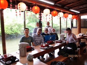 見学後記念館を出て丁度お昼になったので柳川の名物うなぎのせいろ蒸しを食べに予約していたお店に行き、お店では1人後から遅れて来た会員さんと合流して一緒に食事をしました、全員で集合写真撮影。