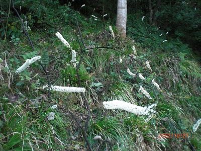 湯ノ浦キャンプ場にある登山口から、案内板を見て七曲コースで山頂へ下山はグラウスコースを取ることに。きちんと整備された登山道を進むと、花の俳句が書かれた看板が次々に出てきて楽しく登り、50分ほどで山頂手前の展望所へ到着。ここからの眺めは素晴らしく、英彦山や嘉穂アルプスなどの山々が良く見えた。山頂は木々に囲まれ展望はなし。下山はグラウスコースを下りていくと、やがてサラシナショーマの群生地があった。フサフサとした猫のシッポのようなユーモラスな花である。キャンプ場に戻った所で昼食を摂った。平日にもかかわらず登山者が多く、花目当てなのだろうか。