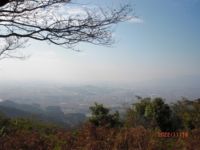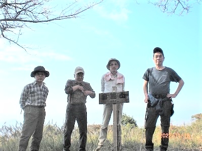 秋晴れの中、大己貴神社(おおなむちじんじゃ)横の歴史の里公園Pに駐車して登山口へ。登山道は最初は少し荒れ気味も順調に登り約82分で山頂へ到着。山頂は広く桜の木もある、展望はもやっていてあまり良くない、耳納連山や花立山などが薄く見えるくらいである。 昼食を摂りながら来年の登山予定を共有して下山へ。途中、往路でスルーした小鷹城山(213m)にも足を伸ばし登山口へ戻った。 今日は急坂も少なくハイキングのような山行でした。