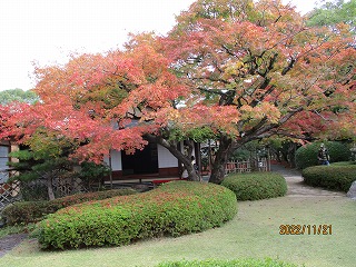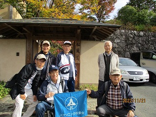内容)10時40分に福岡市営地下鉄「薬院大通(やくいんおおどうり)駅」を出て「松風園」着11時10分、「松風園」の門で記念撮影、園内に入り各自見学、撮影、園内の紅葉をバックに記念撮影して「松風園」をあとに薬院方面へ12時15分に解散しました。
