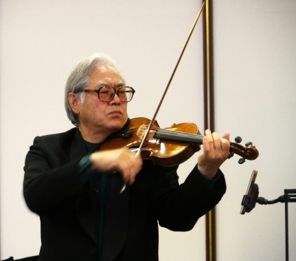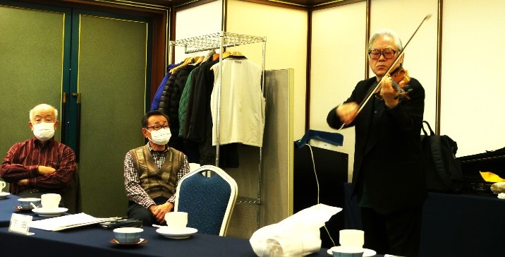 その後、前田様、安藤様から分会設立時の話、廣田様、山田様から健康の大切さなど、記念誌への投稿の話も含めてお話しいただいた。昼食弁当で歓談したあと、江見様によるバイオリン演奏。「春の海」「早春賦」「G線上のアリア」、エルダーの「愛の挨拶」、「ウクライナ国歌」と「ひまわり」
