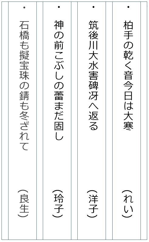 2023.02.6 俳句の会, 同好会 俳句会 令和 5 年 1 月 20 日 俳句ご報告 ・日時 :令和 5 年 1 月 20 日 (金) ・場所 :久留米 五穀神社 ・参加者:4名(角野、岩橋、柳、田中) ・その他:次回は2月18日(土)久留米梅林寺・久留米城跡(篠原山城)の予定です。 投稿者: kouso 俳句の会, 同好会 コメント: 0