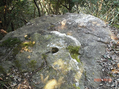 物見の場所と言われた「旗竿石」に着く。大きな石の穴が開けられていて旗竿を差し込んで