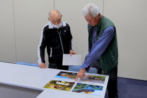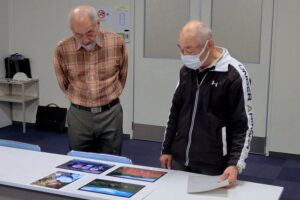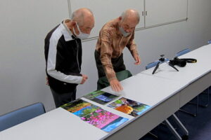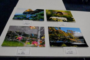 2023年11月11日、福岡市中央区薬院のパナソニックショウルーム福岡3階の31会議室で11時から12時まで開催。参加者は柴田恭輔さん、日下充さん、原田和夫さんの3名。机の上に各自最近撮影された写真が並びました。各人自分の写真の前に立ち撮影状況を説明し、相談役の柴田さんに講評をして貰い今月のベストショットを1枚ずつ選んで頂きました。今回はコスモスや紅葉など秋を感じさせる写真が並びました。