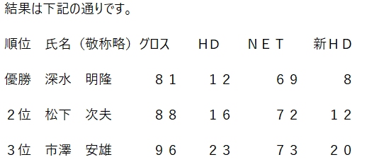 おはようございます。昨日はお疲れ様でした。難しいグリーンコンディションでしたが、病み上がりの深水さんが練習(毎日実施)の成果を発揮され見事アンダーパーで優勝されました。