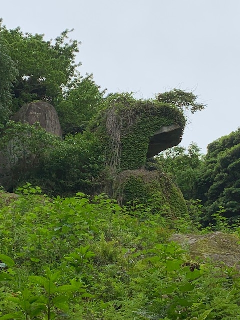 天気はくもりで眺めはイマイチの感じです。 長野緑地の駐車場の笠岩登山口からスタート。登山道は整備されており、エビネランやヒトリシズカなどの草花が植えられている。立派な竹林をすぎてどんどん進んで行くと、笠岩という独特な形の大きな岩が見えてきた。すぐ近くまで行き写真撮影。展望も良さそうであるが、曇っていて見えにくい。