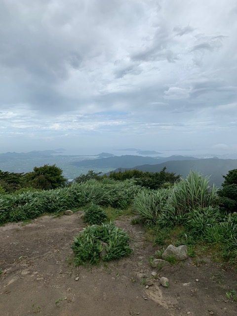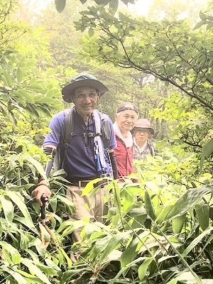 今日、目指す山は 井原山です。 標高983m、この時期 オオキツネノカミソリの花が咲き 登山者が多い山です。水無登山口から登る予定が10日前の大雨で土砂崩れがあり通行止めになっており、やむなく佐賀県側の木場岳に変更です。小雨の中、木場岳からスタート。濡れた登山道を雷の音を聞きながら登って行きます。急坂はあまりないが、山頂に近づくにつれて笹が多くなり、背丈以上のものもあり藪漕ぎ状態の中を進んで行き、70分強で山頂に着いた時は、服はびしょぬれでした。山頂は強風でガスっていて真っ白、時折りのガスの晴間に糸島の海岸や福岡の街が見えています。登山者もこの時期では少なめです。食事を終えて、オオキツネノカミソリ群生地に降りて行く事は断念し下山へ。また笹の藪漕ぎをして木場岳登山口へ下山しました。