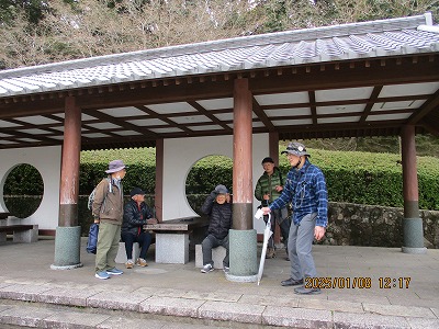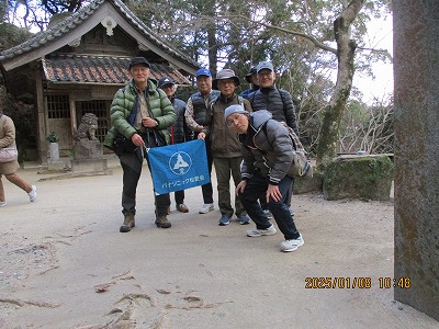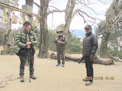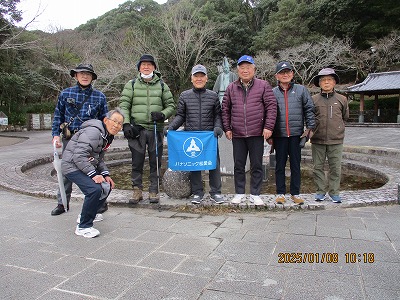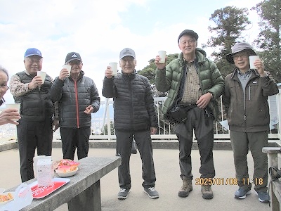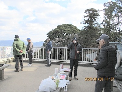 ④内容)10時15分に集合、記念撮影後登山開始、なだらかな坂道を途中の合目毎にある万葉集の歌碑を見ながらのぼり途中の荒穂神社(あらほじんじゃ)に参拝、休憩、記念撮影して山頂へ、山頂前にある436段の急な段を上がって山頂へ、山頂にある菅原道真公がご祭神の天拝山社(てんぱいざんしゃ)に参拝、展望台に上がり、お楽しみの新年祝賀会、用意したお神酒のお酒、お茶等で1年の祈念して乾杯、歓談、天拝山に関するクイズ、展望台からの眺望見学等で過ごして下山、集合場所迄下りて世話役の挨拶で解散