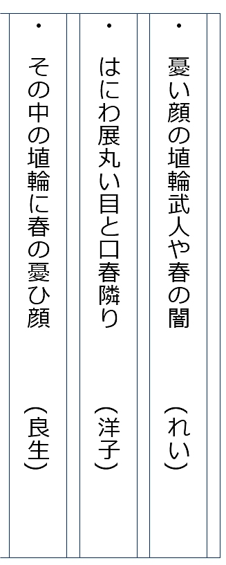 2025.03.2 俳句の会, 同好会 俳句会 R7年2月 俳句ご報告 2月俳句 ・日時 :令和7年2月12日(水) ・場所 :太宰府市九州国立博物館 特別展「はにわ」 ・参加者:3名 投稿者: kouso 俳句の会, 同好会 コメント: 0