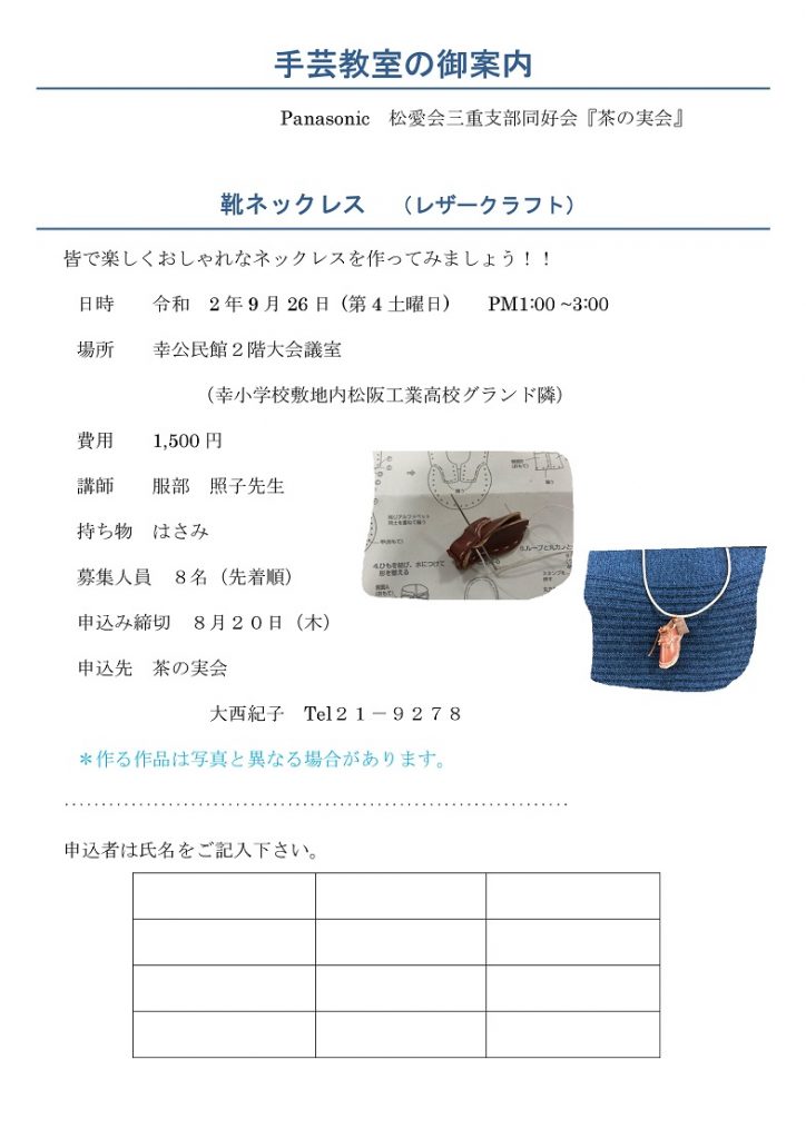 2020.08.17 同好会-2, 支部&同好会開催案内, 茶の実会 茶の実会「手芸教室のご案内」 8月17日、担当者より中止の連絡がありました。 投稿者: Msaru 同好会-2, 支部&同好会開催案内, 茶の実会 No1,この秋の『見どころ』ご紹介!前の記事 No137 伊賀地区ゴルフコンペ次の記事