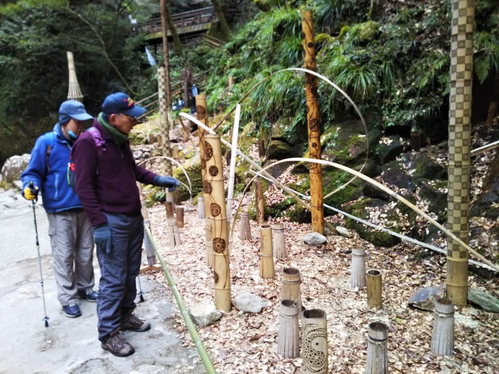入口付近は竹とLEDのオブジェが有り、夜は奇麗との事でしたが竹の加工が素晴らしく、昼までも感激しました。