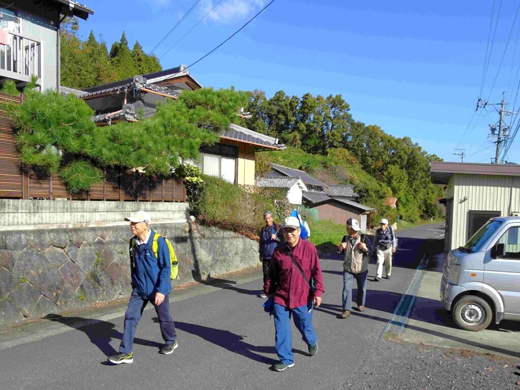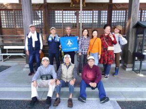 途中、大型車が多く歩道の無い道を通るため、今回初めて「松愛会旗」を持参。参加者から「効果覿面で安心して歩けた!」と有りました。そんな中、お寺の解説書のダブリ間違い。お寺の銀杏の木を間伐して「まな板」を作り、全戸に配布したとか。
