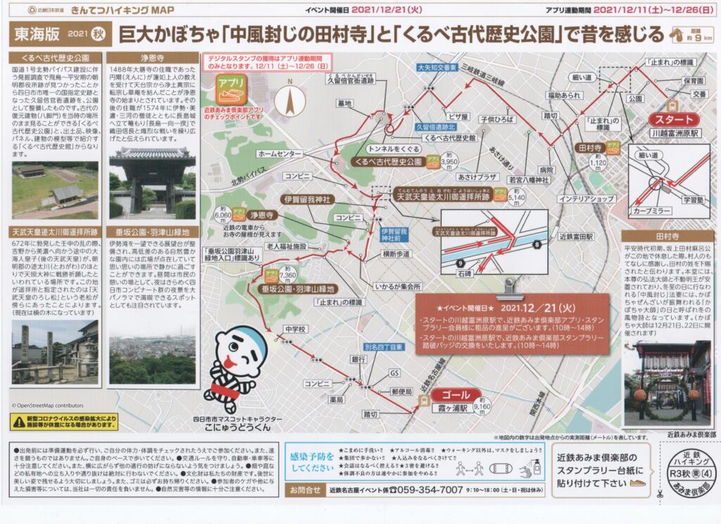 ◆行程: 近鉄川越富洲原駅~田村寺~くるべ古代歴史公園~天武天皇遥拝所跡~伊賀留我神社~浄恩寺~垂坂公園~近鉄霞ヶ浦駅 (約9km)