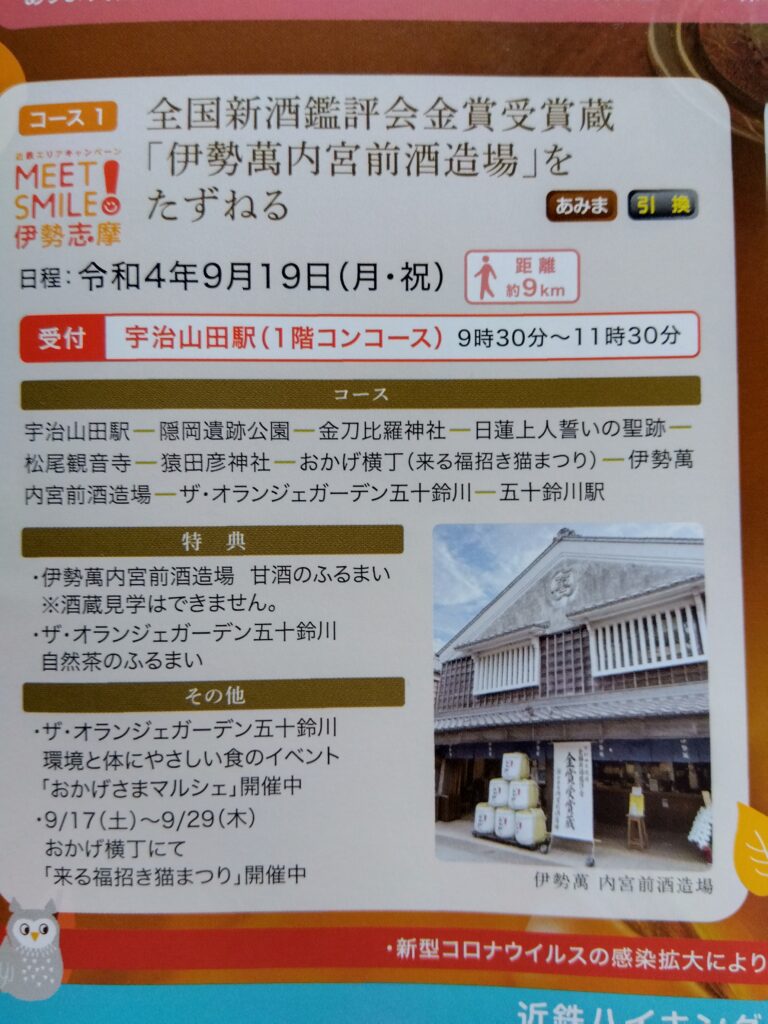 伊勢地区 歩こう会 9月19日・・・中止案内、近鉄ハイキングが復活し急ですが9月19日(月・祝)