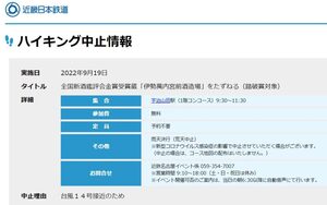 2022年9月19日(月・祝)の近鉄ハイキングですが、台風14号・接近の為、中止です!