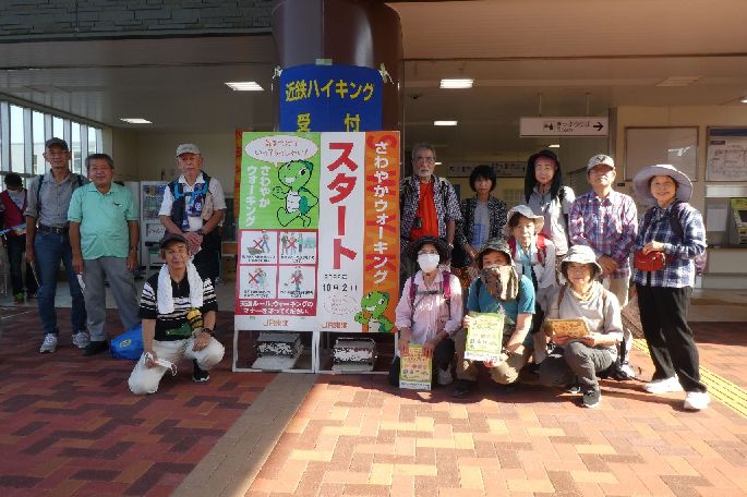 - ①川原町駅で集合写真