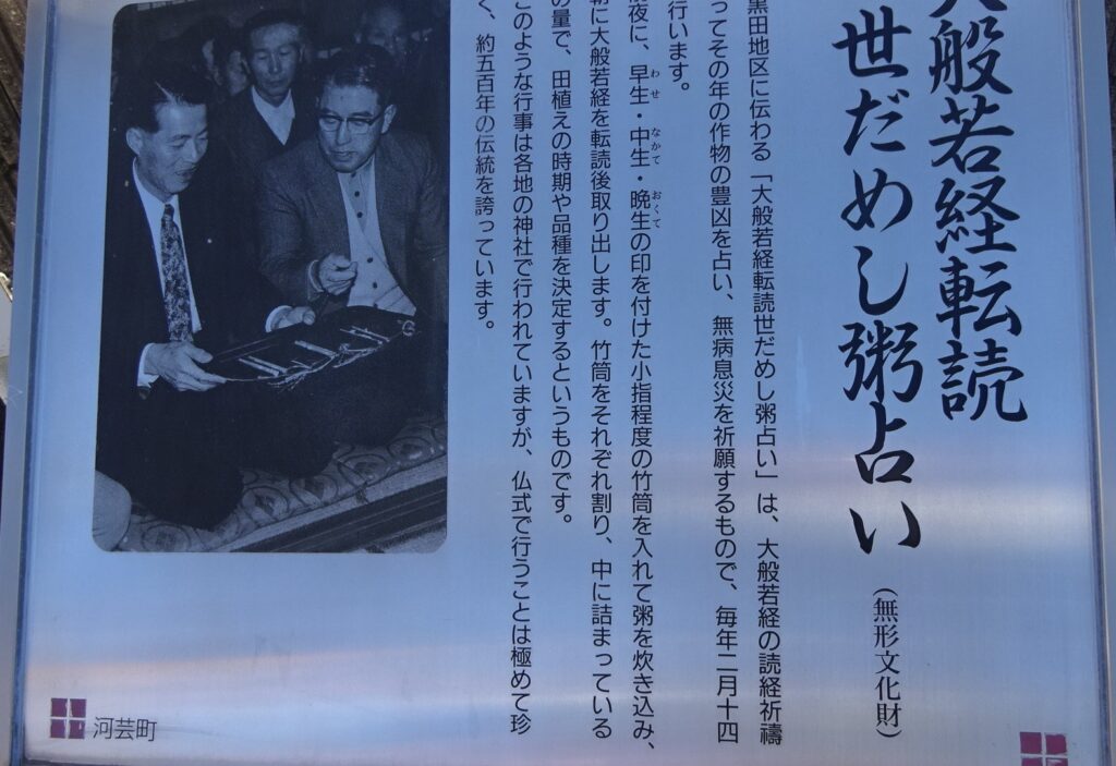次に地域の氏神いねふり神社の入口でお参りを済ませてから津かわげ道の駅に立ち寄りお買い物、休憩してから国道306号線を歩き、途中の地区の無形文化財「粥占い」の看板で地域の歴史も学びました。