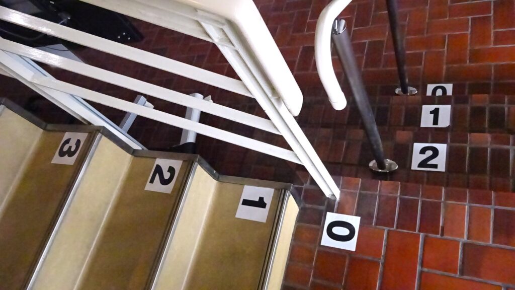 工場内の階段に段数を表示した数字が書かれてあり、残りの段数が良く分かり安全に配慮されていたのが印象的でした。
