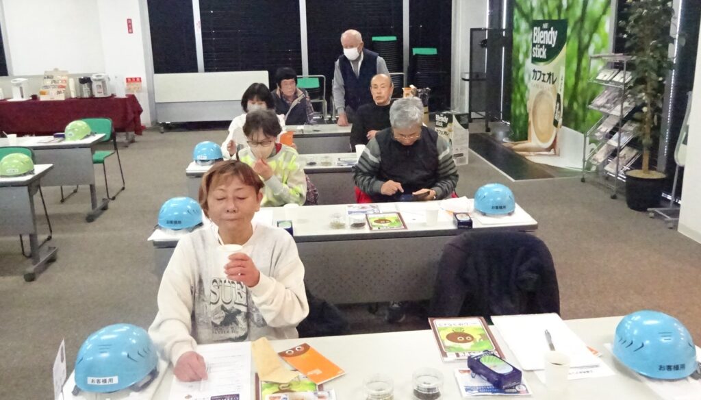 社員の方より会社の概要、コーヒーの歴史、コーヒーの加工工程などを解説頂き、見学用の衣装に着替えて工場見学に行きました。