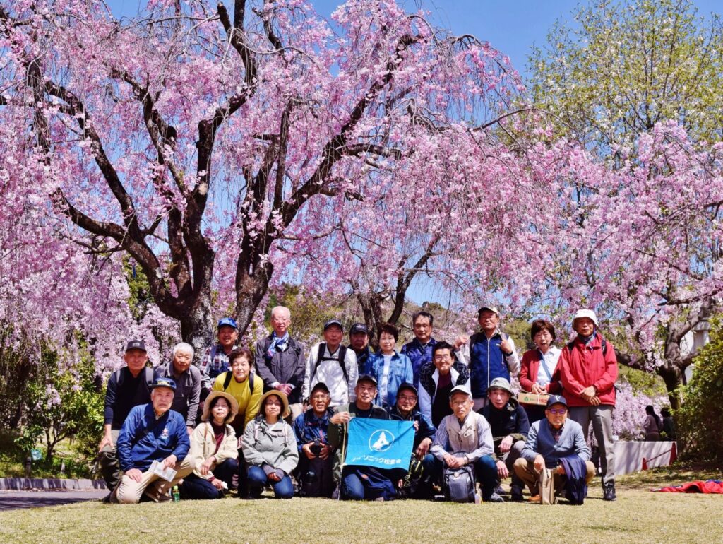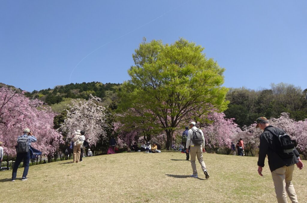 そこから名古屋市の最高峰・東谷山(標高198m)のふもとに広がる東谷山フルーツパークに向かい、しだれ桜の中を散策、小高い丘での昼食タイム。
