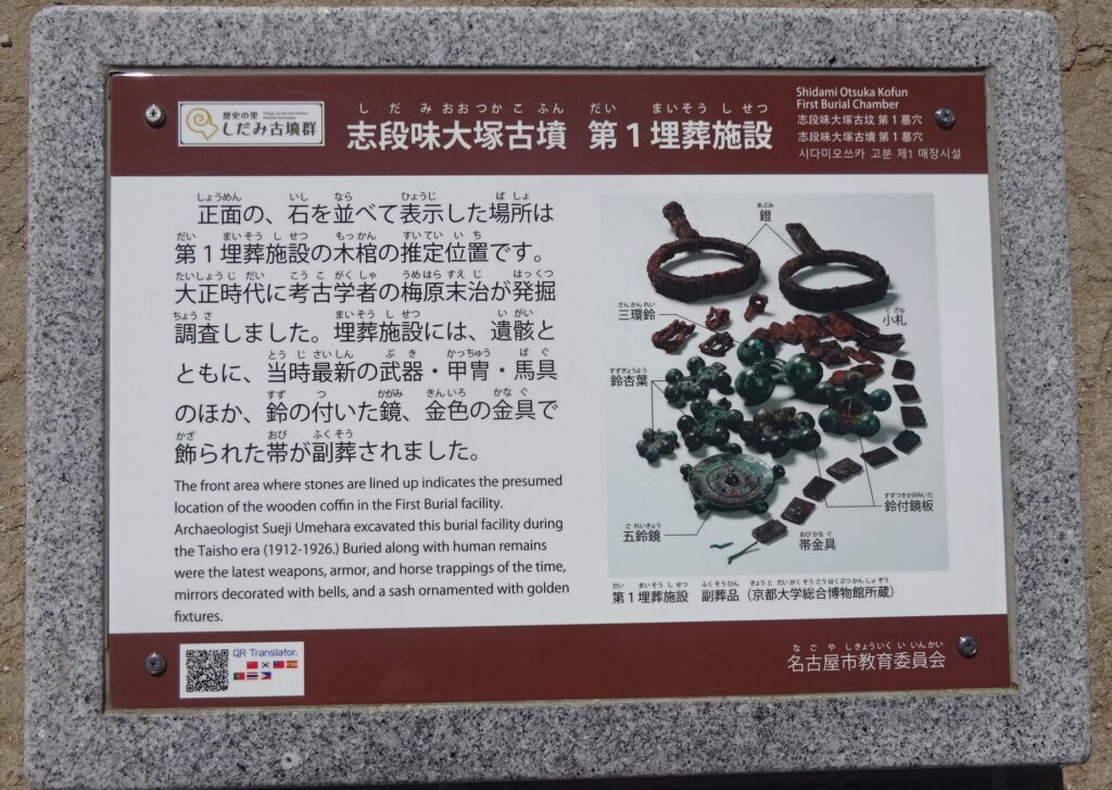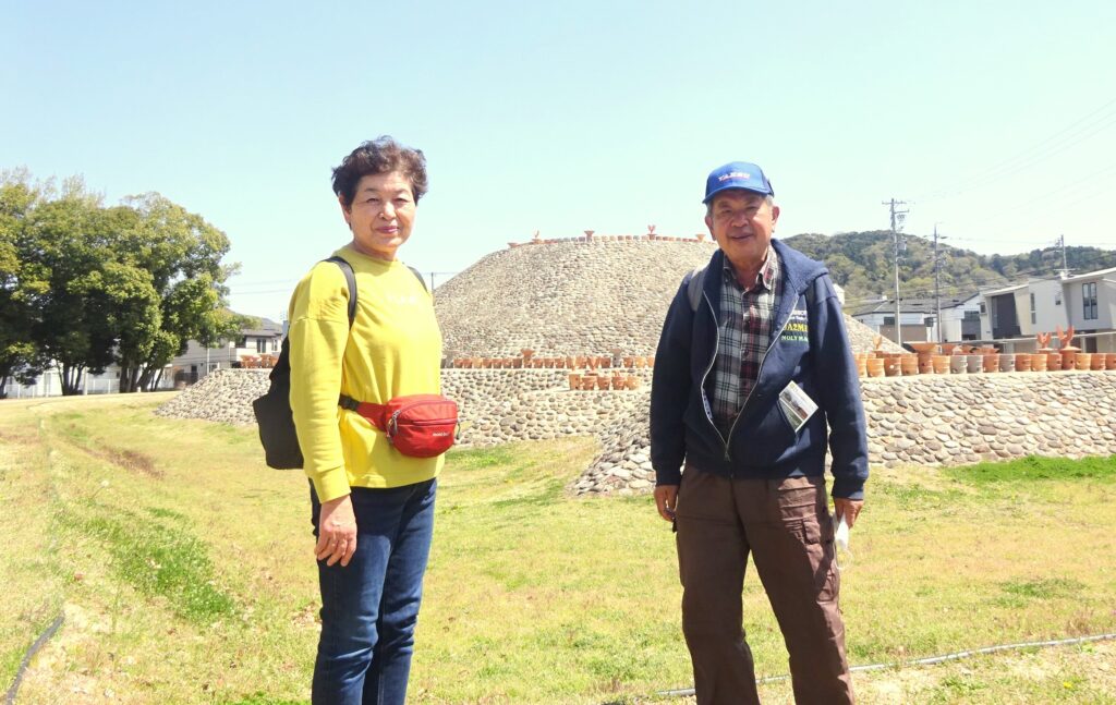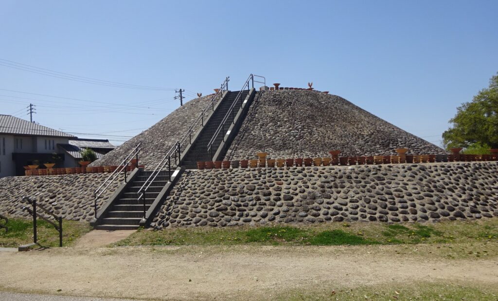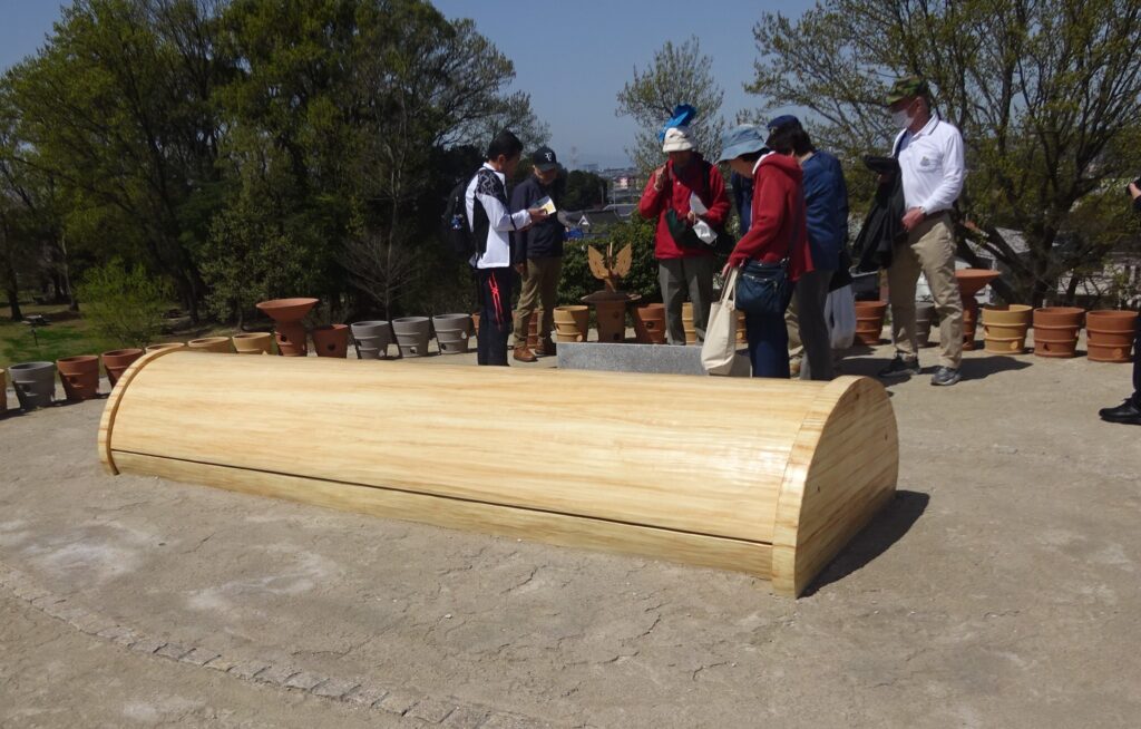 大塚古墳の頂上に登り木棺の模型を見て、周りには土器が並べられている様子も見学。