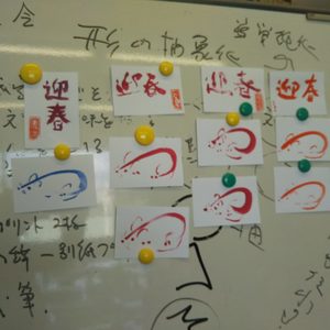 心・気持ちを伝える文字を表そうと筆を取り、「迎春」と気持ちを込め、絵の具で書きました。