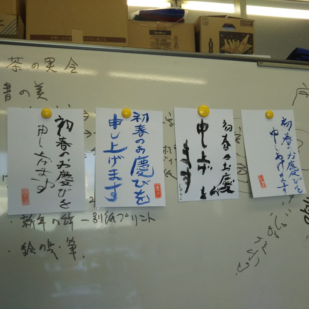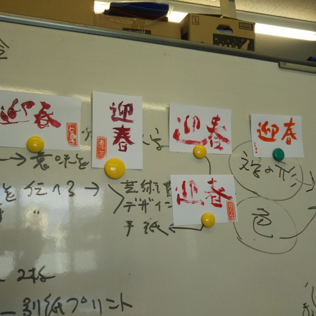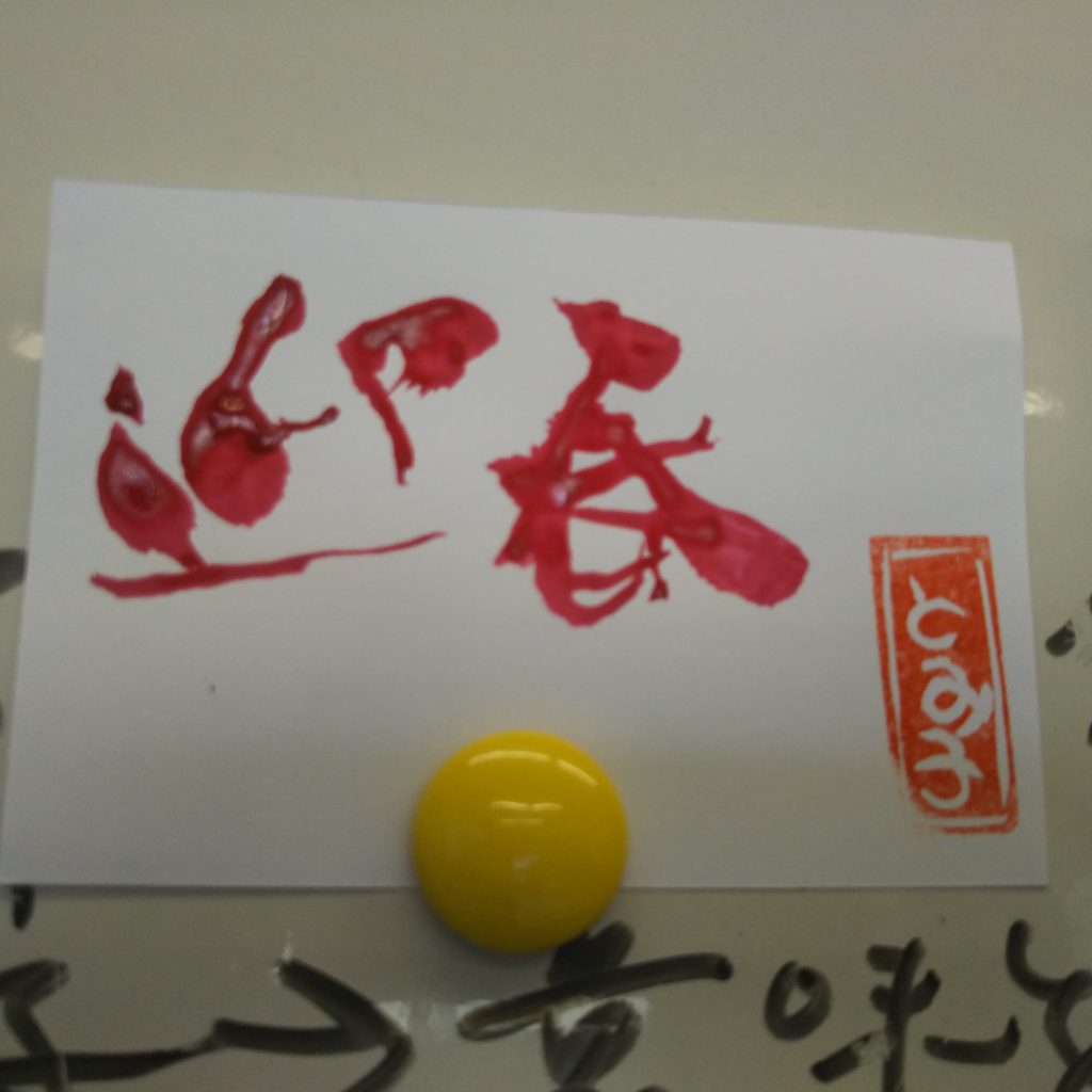 心・気持ちを伝える文字を表そうと筆を取り、「迎春」と気持ちを込め、絵の具で書きました。