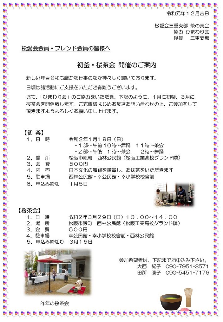 2019.12.12 同好会-2, 支部&同好会開催案内, 茶の実会 初釜・桜茶会 開催のお知らせ 投稿者: Msaru 同好会-2, 支部&同好会開催案内, 茶の実会 伊勢 釣り部会前の記事 No131 伊賀ゴルフコンペ次の記事