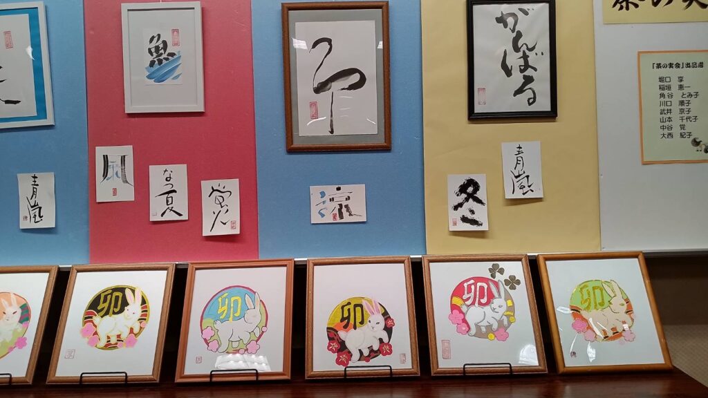 干支のウサギの貼り絵、各人が彫っ洛款、自慢の書を額に入れ、並べてみました。